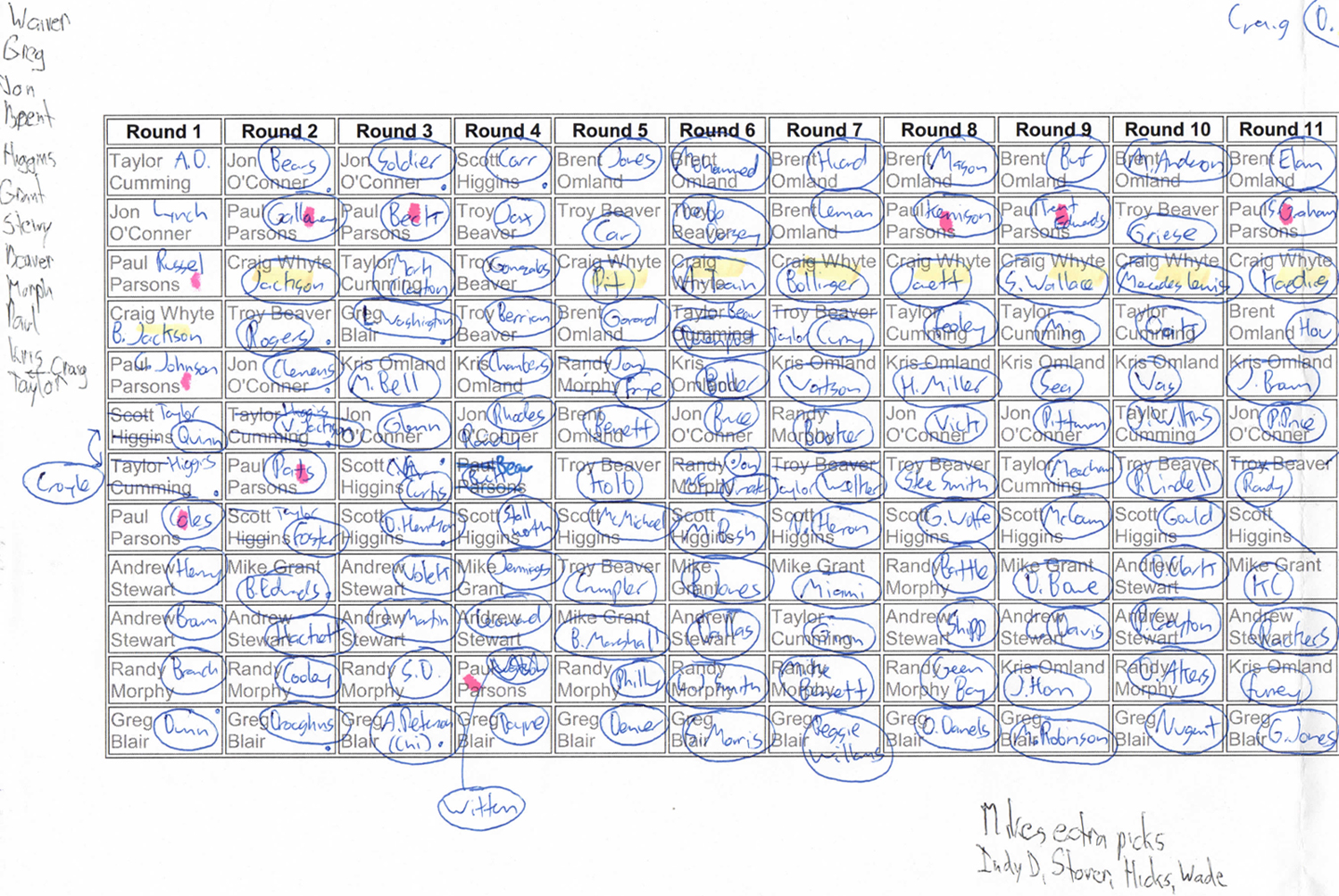 | 11. | Jaguars (D/ST) | Marques Colston (WR) | Niel Rackers (K) | Jeff Wilkins (K) | John Kasay (K) | LenDale White (K) | Tony Gonzales (TE) | Nate Kaeding (K) | Robbie Gould (K) | Josh Brown (K) | Jason Hanson (K) | John Carney (K) |