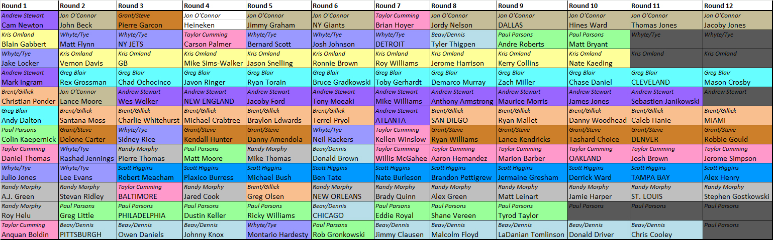 | 14. | Reggie Bush (RB) | Vincent Jackson (WR) | Dolphins (D/ST) | Steve Smith (WR) | Vikings (D/ST) | Javon Ringer (RB) | Brett Favre (QB) | Ravens (D/ST) | DeAngelo Williams (RB) | Joe Webb (QB) | Kevin Kolb (QB) | Brady Quinn (QB) |