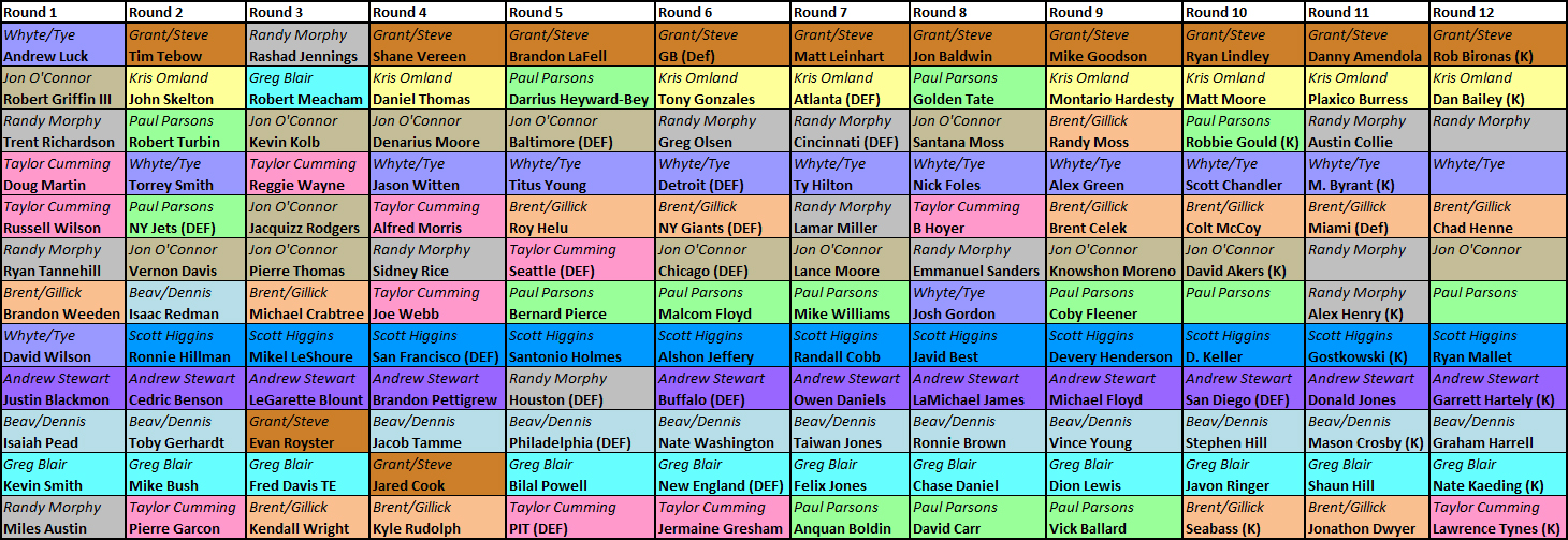 | 13. | Brady Quinn (QB) | Antonio Gates (TE) | Montario Hardesty (RB) | Peyton Manning (QB) | John Beck (QB) | Jackie Battle (RB) | Josh Freeman (QB) | Javon Ringer (RB) | Darren McFadden (RB) | Bears (D/ST) | Delone Carter (RB) | Joseph Addai (RB) |