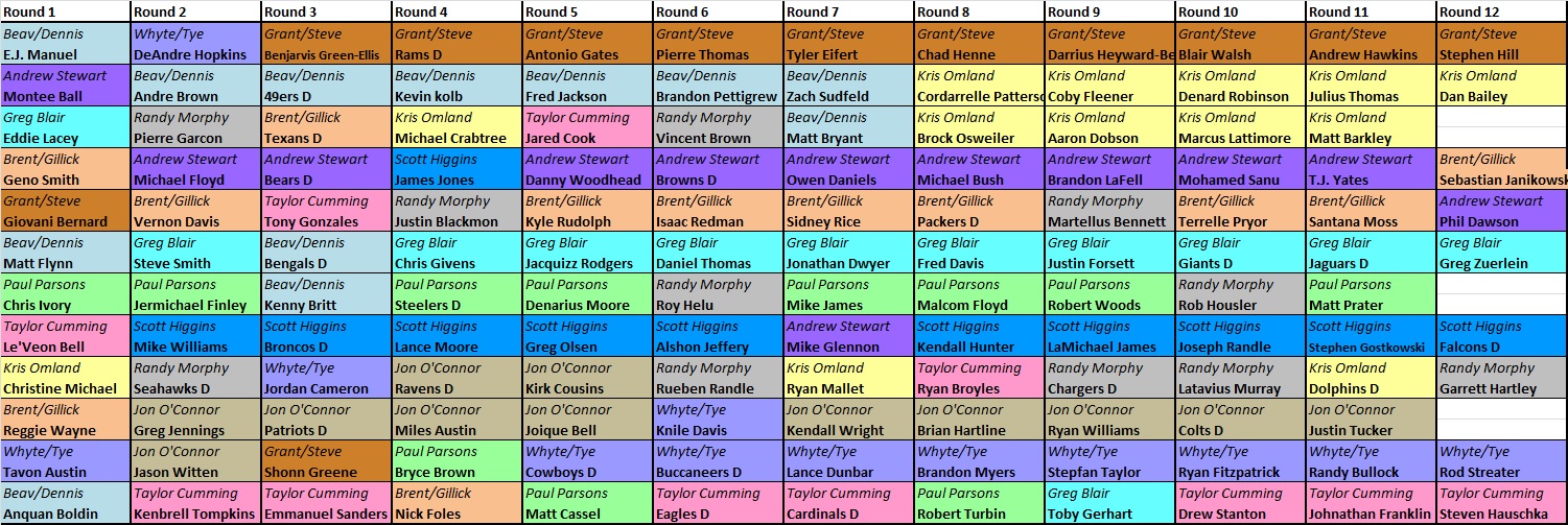 | 19. | Raiders (D/ST) | Kirk Cousins (QB) | Chris Ivory (RB) | Nate Washington (WR) | LeGarrette Blount (RB) | Taiwan Jones (RB) | Bilal Powell (RB) | Colt McCoy (QB) | Jason Campbell (QB) | Charlie Batch (QB) | DeAngelo Williams (RB) | Rueben Randle (WR) |
