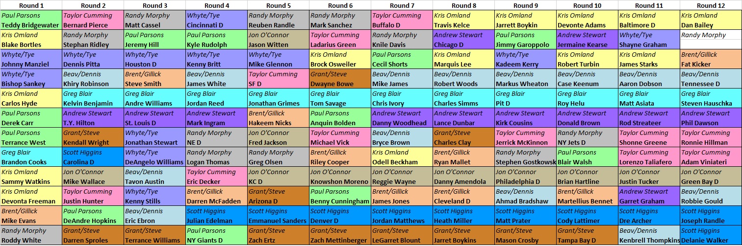 | 19. | Matt Cassel (QB) | Brandon Pettigrew (TE) | Chris Ogbonnaya (RB) | Taiwan Jones (RB) | Doug Baldwin (WR) | Ahmad Bradshaw (RB) | Cordarrelle Patterson (WR) | Thad Lewis (QB) | Jarrett Boykin (WR) | Terrance Williams (WR) | Seahawks (D/ST) | |