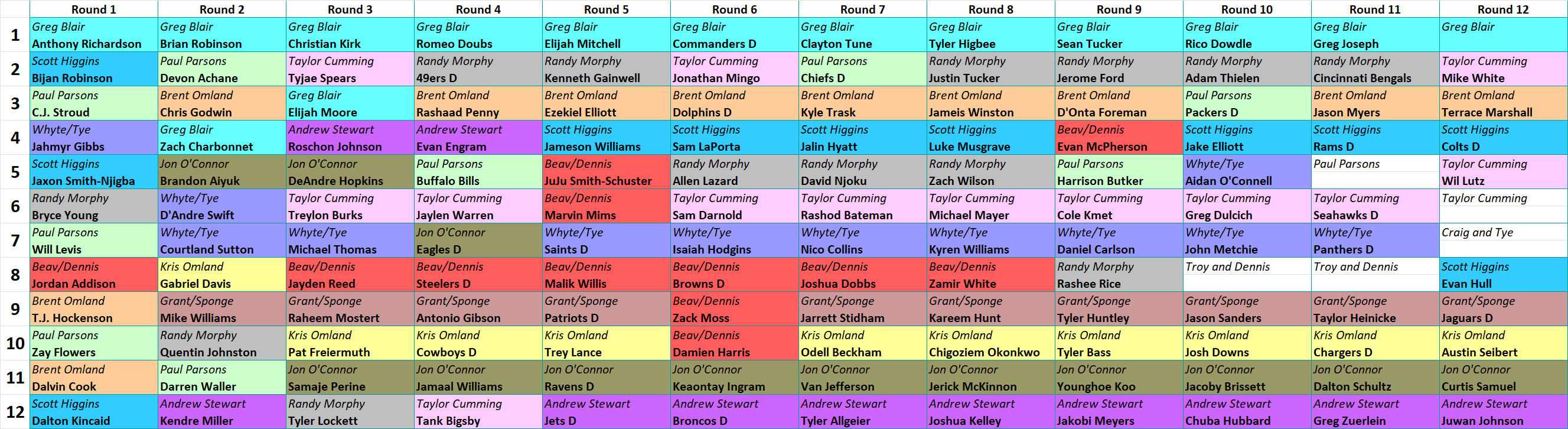 | 10. | Browns (D/ST) | Cowboys (D/ST) | Raiders (D/ST) | Cardinals (D/ST) | Eagles (D/ST) | Bills (D/ST) | Antonio Gibson (RB) | Desmond Ridder (QB) | Lamar Jackson (QB) | Seahawks (D/ST) | Bengals (D/ST) | Drake London (WR) |